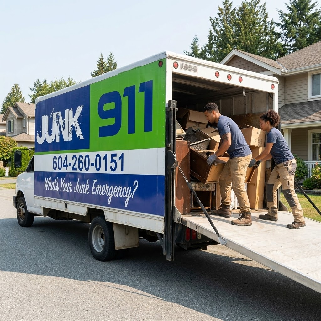 Junk 911 crew loading a branded Junk 911 truck in front of a home in Greater Vancouver